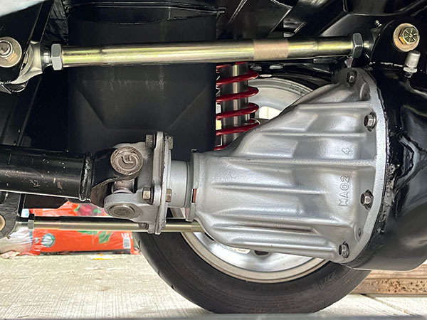 Rear Suspension: Custom 3-link of my own design. The top link is a Speedway 1" OD swedged steel tube, part#: 91034234-13, and measures 438mm center-to-center angled upward 3.1 degrees at static ride height (loaded). The lower links are Speedway 1" OD swedged steel tube, part#: 91034234-15, and measure 508mm center-to-center, installed level at static ride height (loaded). The lower links are parallel, mounted 865mm apart and 73mm below axle centerline. All three links utilize Ballistic Fabrications forged chromoly 2" rod ends with 1/2" bore balls and 3/4-16 shank threads, part#s BJ-678-11 & BJ-678-12. The rod ends have hardened 416 stainless balls supported by Nylatron GS races. (From 2025 onward, Ballistic rod ends these come with polyurethane races.) The rod ends support up to 33 degrees of misalignment, and are adjustable to eliminate play. The Panhard rod is a Speedway 7/8" OD swedged steel tube, part# 91034258-29.5. The Panhard rod utilizes QA1 PCM-series 5/8-18 shank Heim joints, it measures 800mm center-to-center, it's installed 75mm below axle centerline, and it's level at static ride height (loaded). Ridetech HQ 6.3" stroke mono-tube, gas-pressurized coilover shock absorbers with forged and anodized aluminum bodies, 1.834" pistons and 5/8" chromed shafts. Their 24-position rebound adjustment knobs are mounted at the top of their 2" stud mounts, inside the cabin, within reach from the drivers seat. Eibach 14" 150#/in springs.