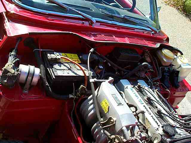 The air cleaner/mass air sensor unit was mounted on the left side of the engine compartment forward of the radiator and connected to the intake plenum using two stock Toyota air inlet tubes. The stock Spitfire cardboard engine shields were replaced with custom fabricated steel and square tubing units which give a very tidy appearance to the engine compartment.
